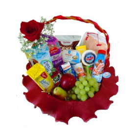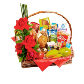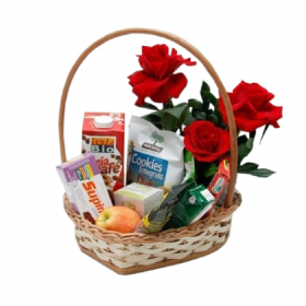 Um café da manhã saboroso e surpreendente para demonstrar seu carinho e enviar sua mensagem especial… 3 tipos de frutas, um arranjo de rosas, 01 Sachê de café; 04 Mini Panini 100g, 01 Achocolatado 200ml; 02 Sachês de açúcar; 02 Bolachas doce 15g (uni); 02 Bolachas salgadas 7g, 01 Bolinho 40g; 01 Cappuccino 20g; 01 Iogurte; 01 Maçã; 02 Manteigas 15g, 01 Patê 100g. Cerca de 25 itens.