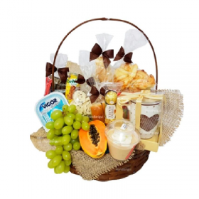 Um café da manhã saboroso e surpreendente para mostrar seu carinho e enviar sua mensagem especial… 3 tipos de frutas, uma caixa de bombons, 01 Sachê de café; 04 Mini Panini 100g, 01 Achocolatado 200ml; 02 Sachês de açúcar; 02 Bolachas doce 15g (uni); 02 Bolachas salgadas 7g ; 01 Bolinho 40g; 01 Cappuccino 20g; 01 Iogurte; 01 Maçã; 02 Manteigas 15g, 01 Patê 100g. Cerca de 20 itens.
