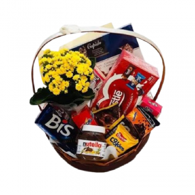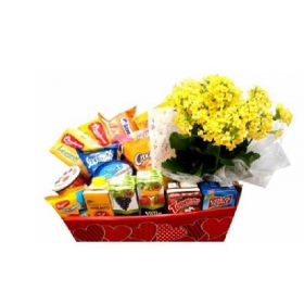 Cesta de Chocolate com Arranjo de Flores.